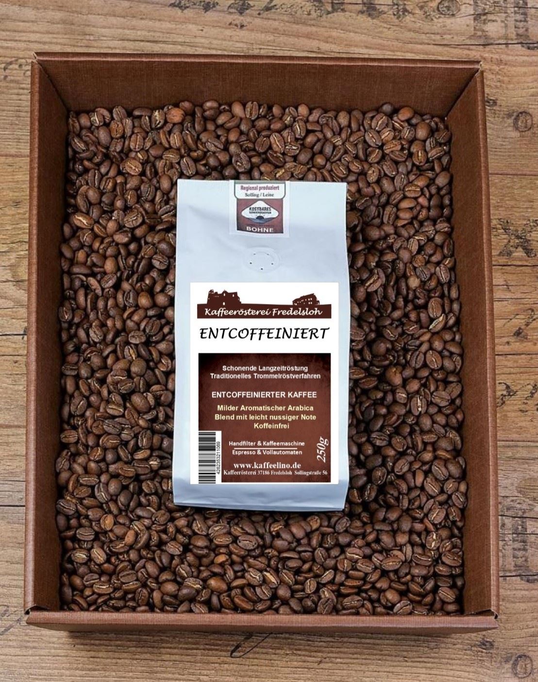 Unser entkoffeinierter Arabica verbindet harmonischen Geschmack mit sanfter Entspannung – ideal für jede Tageszeit. Die Bohnen werden sorgfältig aus 100 % Arabica ausgewählt und schonend entkoffeiniert, wahlweise mit der CO₂- oder der WaterSwiss-Methode, die die natürlichen Aromen bewahren und ein intensives, klares Geschmacksprofil ermöglichen. Das Ergebnis ist ein feiner Kaffee mit harmonischer Balance, dezenter Süße und einem runden Abgang, der den Charakter eines klassischen Arabica bewahrt. Ob als Filterkaffee, Espresso oder French Press – dieser Kaffee bietet Genuss ohne Kompromisse und bringt das volle Aroma direkt in Ihre Tasse, ganz ohne Koffein.
