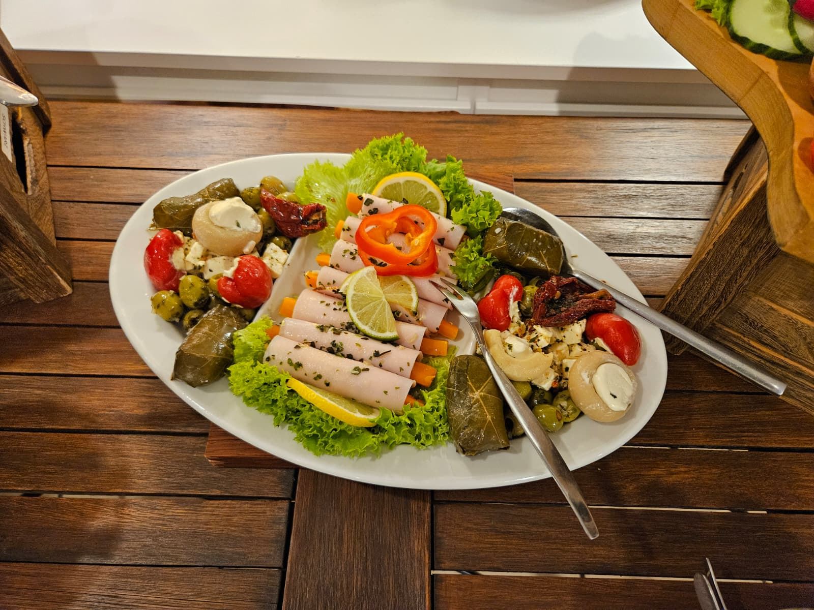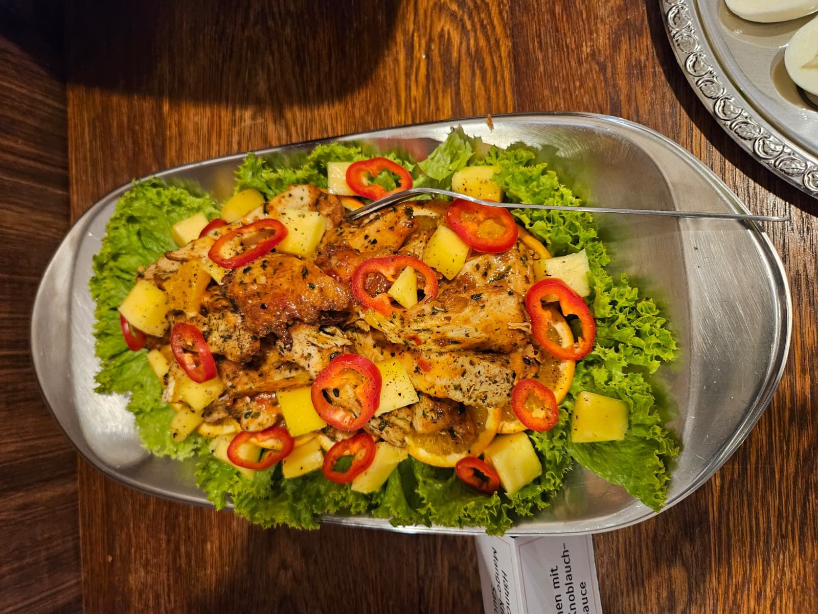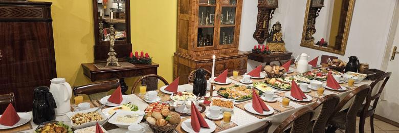Einmal im Monat bieten wir ein reichhaltiges Sonntagsfrühstück in Buffetform an. Dies beinhaltet hausgerösteten Kaffee satt, Tee, ein Glas Orangensaft, Butter, hausgemachte Marmelade, Honig, Früchte mit Joghurt, diverse Wurstwaren (Schinken, Mettwurst), verschiedene Käsesorten, Rührei, gekochte Eier, Lachs, Antipasti, unterschiedliche Salate, Tomaten mit Mozzarella sowie weitere hausgemachte Köstlichkeiten.